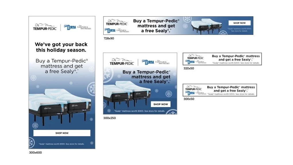 I had the pleasure of Co-oping with the Icon Commerce for two semesters. Here, I created designs for digital, social, and print assets for Tempur-Sealy® including Tempur-Pedic®, Sealy®, Stearns & Foster®, and co-branding clients around the country. My designs ranged from turn-key assets to completely custom campaigns for clients such at Ashley Furniture. Below are just a few custom jobs that I produced.